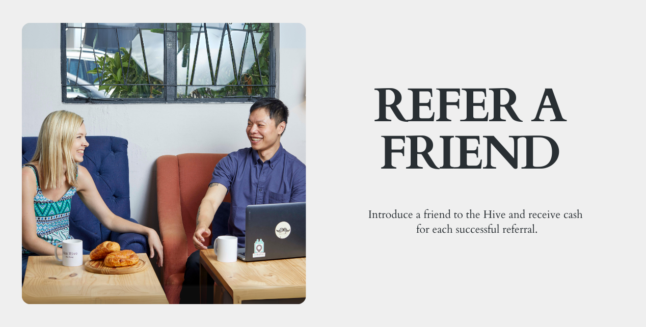 Refer a friend or business to the Hive and earn cash for each successful referral. Applies to all membership types including Hot Desks, Dedicated Desks and Private Offices.